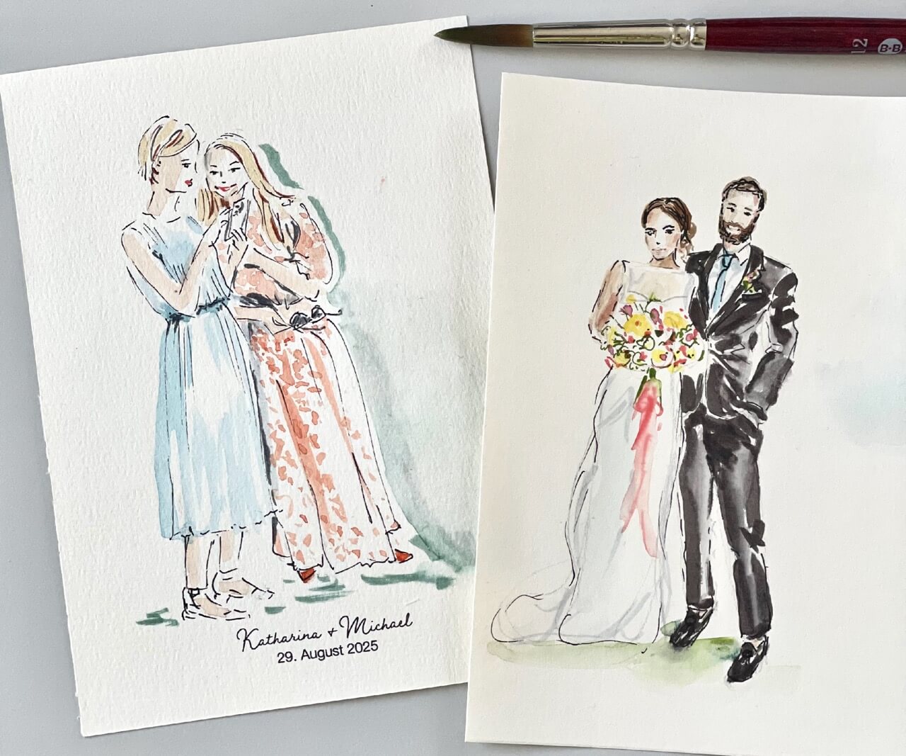 Für Gästeportäts verwende ich normalerweise hochwertiges Aquarell-Papier in A5-Format. Auf Wunsch kann ich auch A6/ Postkartenformat einsetzen. Preislich macht das keinen Unterschied. Größere Formate (bis A3) sind natürlich auch gegen einen Aufpreis möglich.
