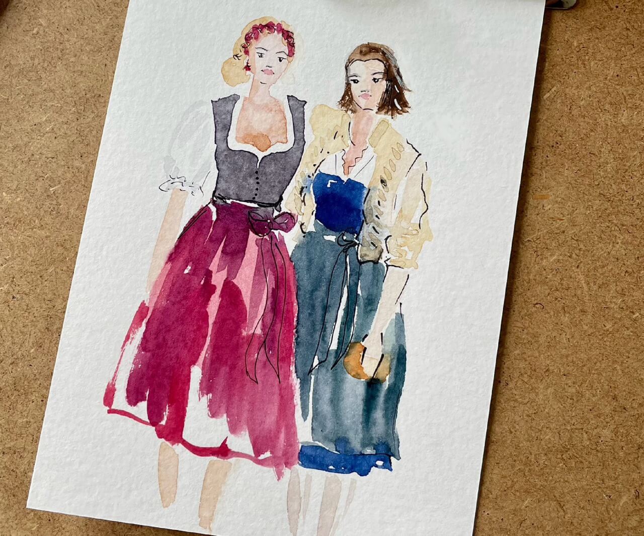 Mit ein paar Linien und Pinselstrichen ist das zauberhafte Paar in wenigen Minuten gemalt. Interessiert schauen mir einige Gäste „über die Schulter“. Dabei kommen sie schnell miteinander ins Gespräch.