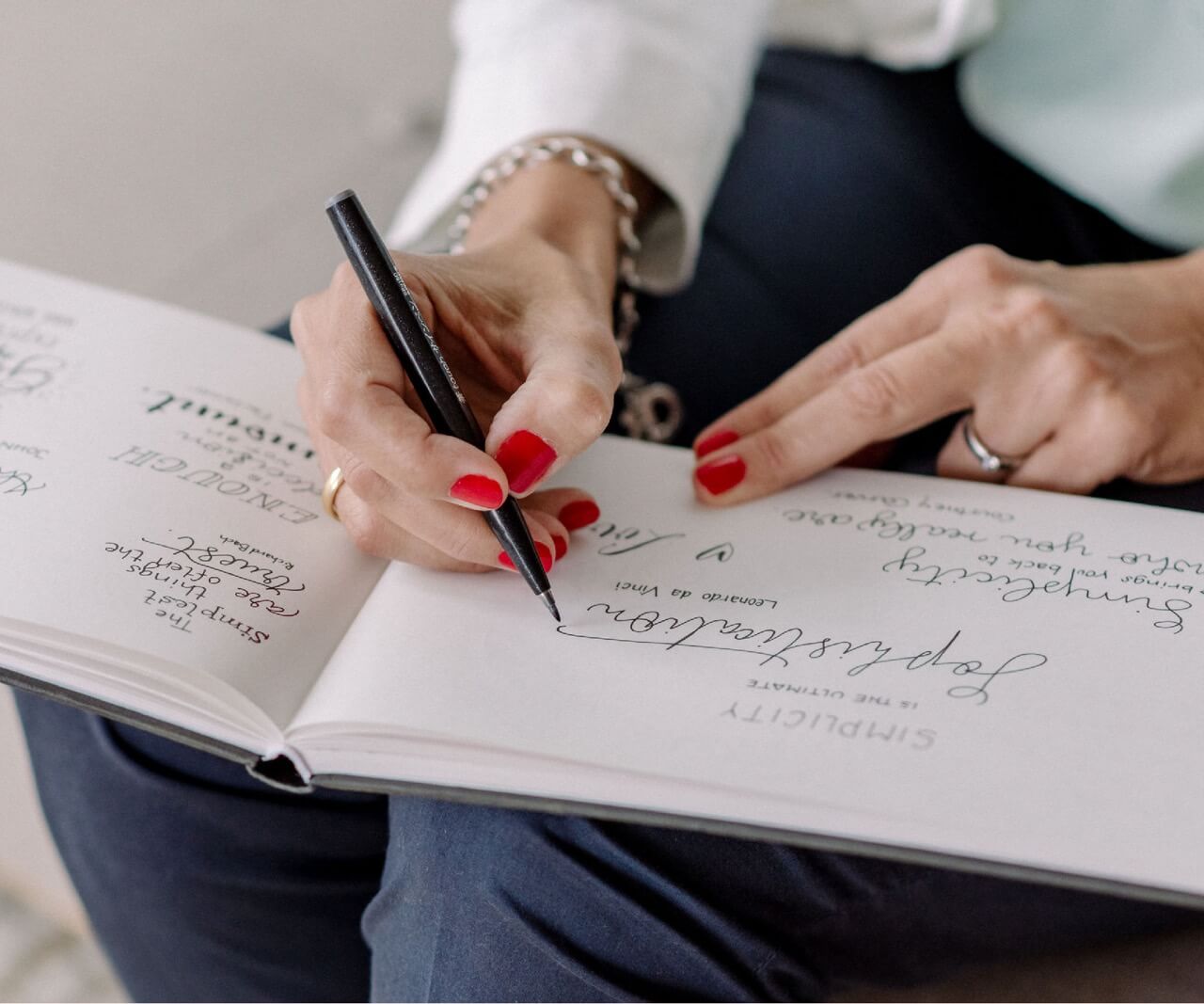 Mit der Spitzfeder zeichne ich Namen auf Platzkarten oder beschriftete Umschläge für Ihre Einladungen. Mit eleganter Schreibschrift gestalte ich individuelle Einträge in Ihr Gäste- oder Familienbuch.