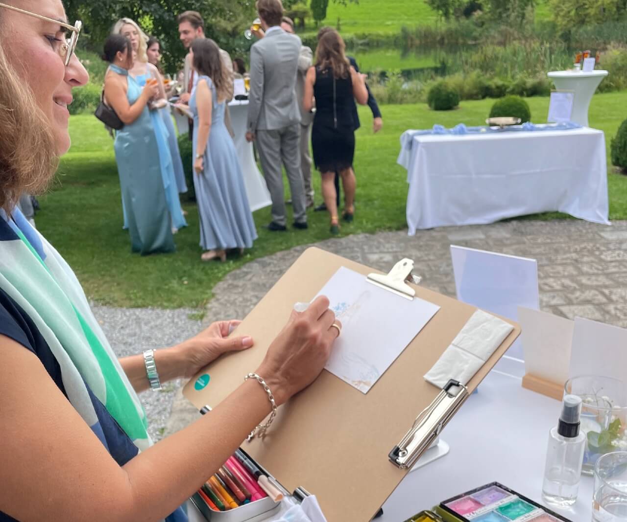Sie war super lieb, hat perfekt mit unseren Gästen harmoniert und die Idee kam unglaublich gut an. Jeder, der wollte, konnte sich zeichnen lassen und die Bilder waren ein wunderschönes und persönliches Gastgeschenk. Alles lief absolut reibungslos und mit viel Herz. Unsere Gäste schwärmen noch immer davon – wir können sie nur von Herzen weiterempfehlen!“